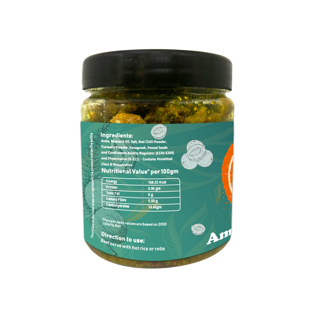 Amla, Mustard Oil, Salt, Red Chilli Powder, Turmeric Powder, Fenugreek, Fennel Seeds and Condiments Acidity Regulator (E330-E260) and Preservative (E-211) – Contains Permitted Class II Preservative.