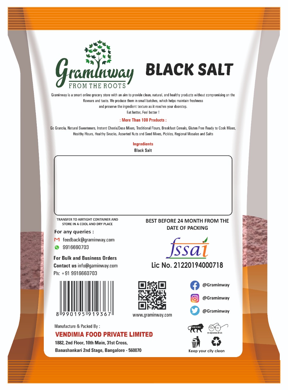Graminway Black Salt is referred to as kala namak, is a variety of Indian volcanic stone salt. It is popular in India, and nations all across the world because of its twisted taste and easy availability. This special variety of salt has its origin in the Himalayan ranges and is widely used in north indian dishes for cooking. Kala namak is used extensively in Bangladesh, Nepal, India and Pakistan as a condiment or added to chaats, chutney, salads, all kinds of fruits, raita and many other savory Indian snacks.