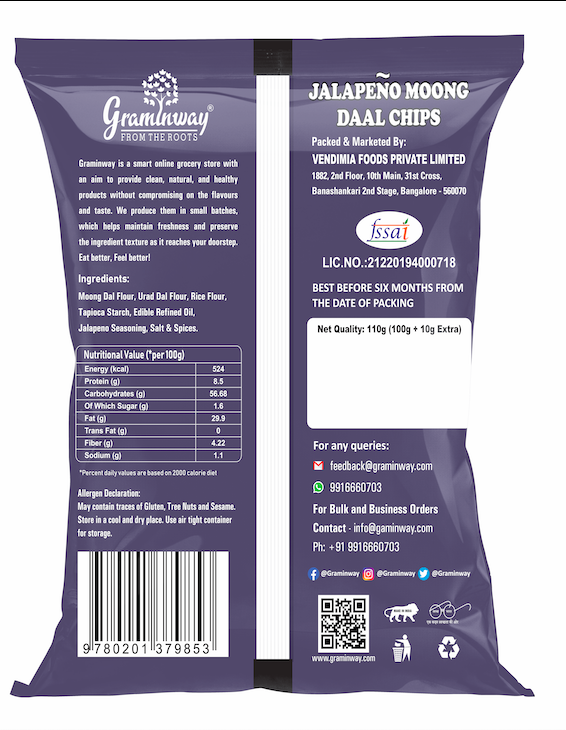 One of the most widely used lentils in Indian cuisine, yellow moong dal is used to make both sweet and spicy dishes. Moong dal is great for weight loss, improving heart health, lowers blood sugar, and aids digestion. Graminway’s Moong Daal Chips Jalapeno is a fusion of two cultures. The Indian dinner staple meets Mexican favourite jalapenos in a wonderful spicy, tangy melange. Moong daal is cleaned, finely ground, and made into a soft dough. We throw in Indian seasoning and jalapeno peppers, cut the dough into strips, and irresistible, healthy chips are ready. Now, this is a snack you can reach out for, guilt-free!