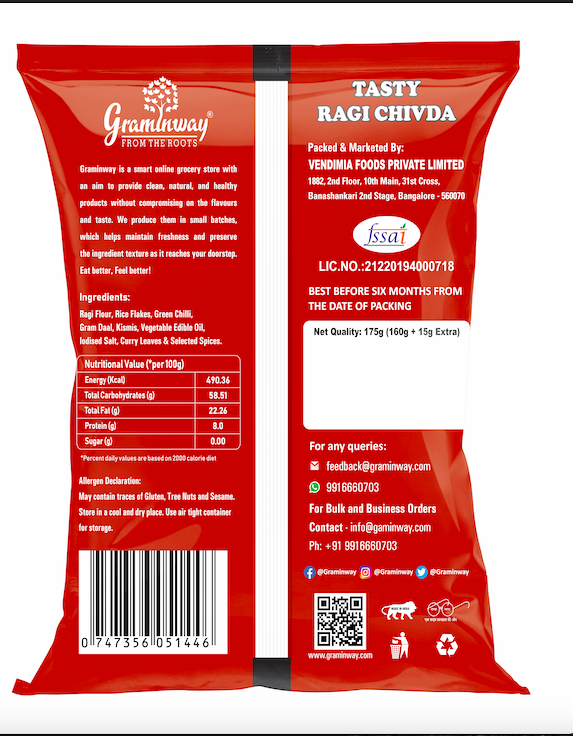 Graminway’s Tasty Ragi Chivda is vegan, dairy and gluten-free, and is made from locally sourced ragi. We only pick natural ragi farmers who cultivate the crop using sustainable farming methods and without chemicals or pesticides. Chivda is irresistible but it’s usually full of unhealthy fats and oils. That’s why we made ours with ragi, spiced sev, and puffed rice, which combines nutrition with flavor to tantalize your taste buds. Now, you don’t have to stop yourself from reaching for that chivda dabba anymore!